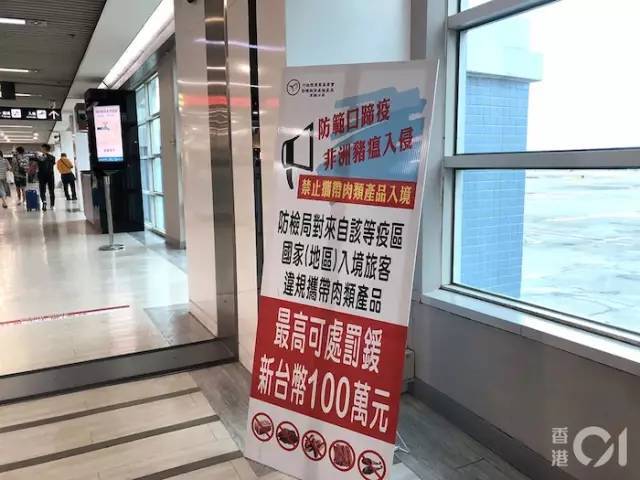 近日,香港01新闻记者前赴高雄国际机场直击当地入境防疫措施。现场入境大堂与通道多个当眼位置张贴告示,提醒旅客切勿携带疫区肉品入境,违者将罚款。另外,若旅客在入境前14天内曾接触畜牧场及农场动物,也应该主动联络动植物检疫柜台。