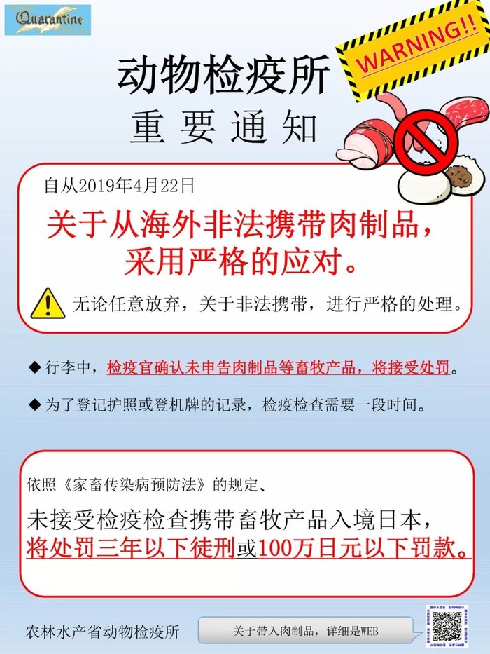 日本:从今年4月22日起对携带肉类产品入境、未申报被查获的旅客将以重罚,最高将被裁罚100万日元(约合6.3万元人民币)或3年有期徒刑。