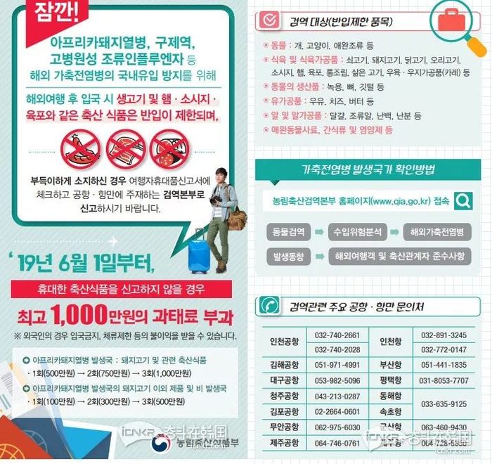 从其他国家携带猪肉产品入境,首次被查获将被罚100万韩元,第3次将被罚500万韩元。
