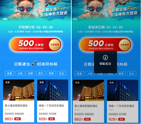 此次发放的是全球目的地通用的500元返现券,只要预定满501元就可以使用!5月20日-28日,每天10:00-22:00,每小时整点开抢!
