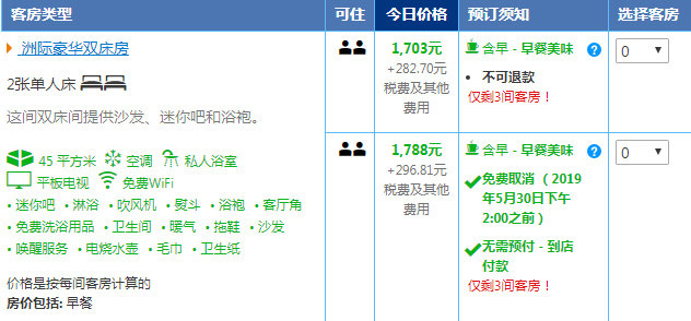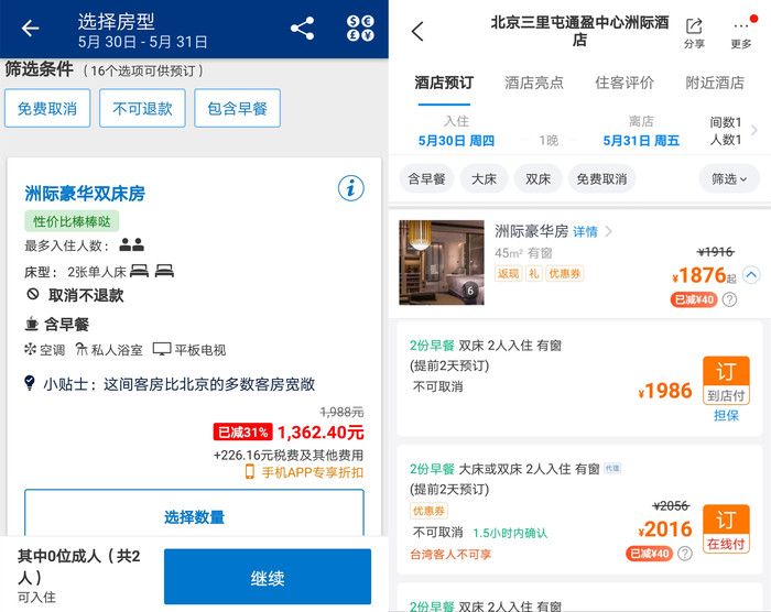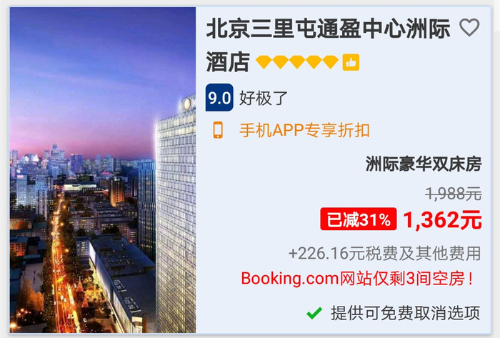 如果指定酒店同期有中国旅客特惠或手机端特惠,可以叠加享受!比如北京三里屯通盈中心洲际酒店,网页版显示价格为1986(含税):