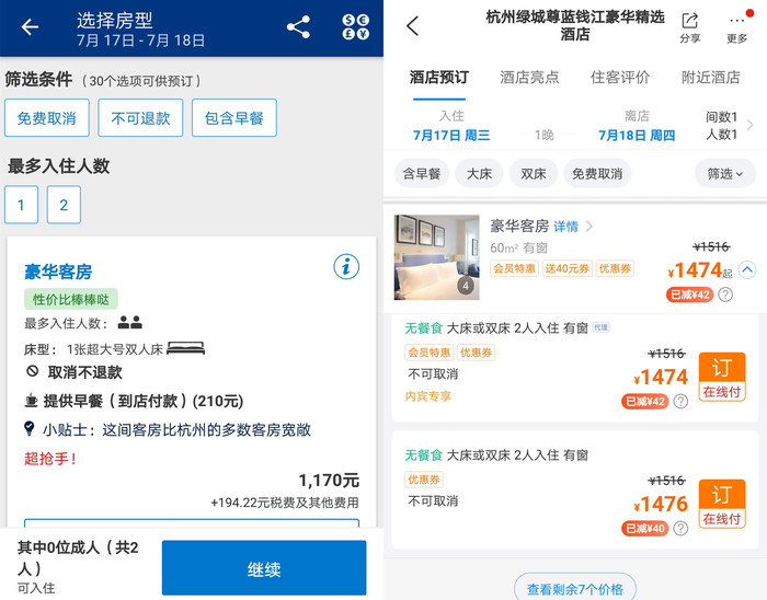 同时间同房型不含早,booking App价格为1364元(含税),某程上价格1474元(含税),在booking App预订立马节省110元!