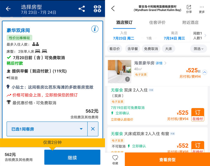 同时间同房型(配图为同一房型,只是名称叫法不同),booking App价格为562元(含税),某程上价格619元(含税),在booking App预订立马节省57元!