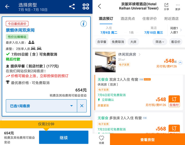 同时间同房型不含早,booking App价格为654元(含税),某程上价格674元(含税),在booking App预订立马节省20元!