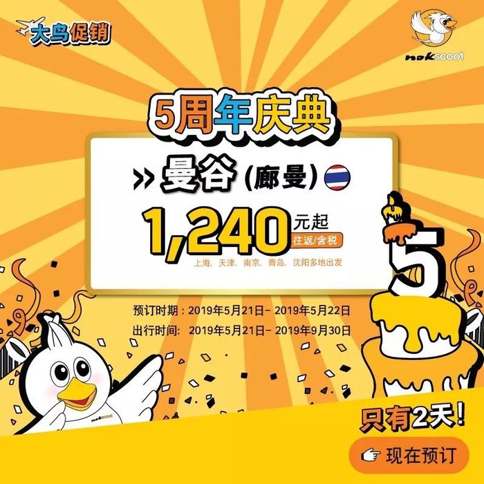 鸟航的五周年庆典活动继续,上海、天津、南京、青岛、沈阳多地出发泰国曼谷(廊曼),往返含税1240元起~