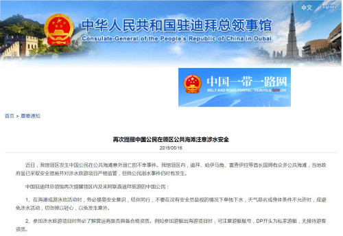 中国公民迪拜海滩意外溺亡 中领馆吁注意涉水安全