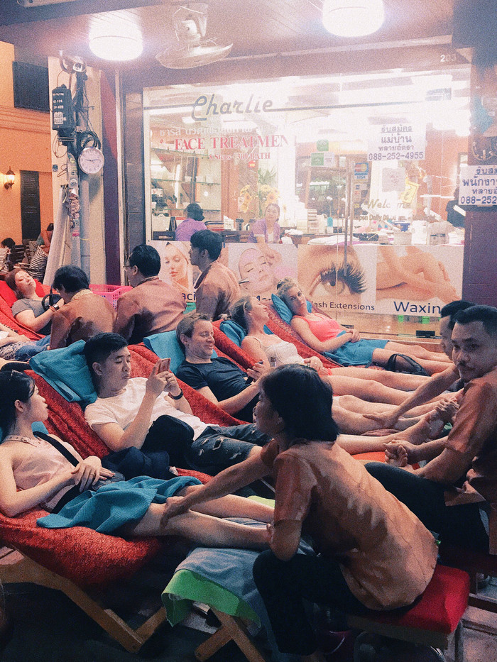 而且这里的马杀鸡特别便宜!只有市区价格的60%,250-350泰铢/小时,很多人会选露天马杀鸡座位,边捏脚边听隔壁酒吧的音乐,好嗨呀!