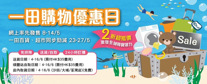 其实5月除了崇光店庆,一田购物优惠日也够够够够优惠哦~5月23-27日,港九新界一共11间分店同步促销,人气护肤彩妆品、日本母婴用品,还有超市美食...通通大减价!