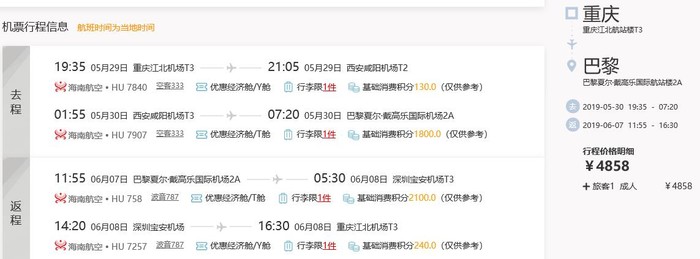 重庆=巴黎,往返含税4.8k
