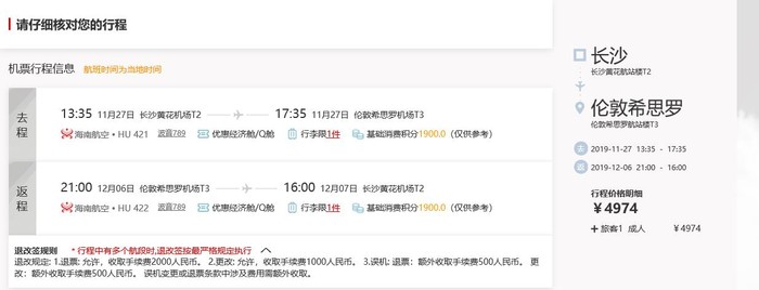 长沙=伦敦希思罗,往返含税4.9k