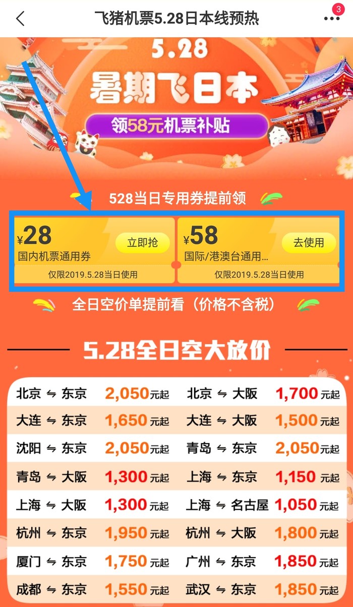 最近飞猪APP的好多页面上都可以领取28元国内机票券以及58元国际/港澳台机票券,如上图方框所示,没有领券的现在可以先领上,5月28日当天使用~