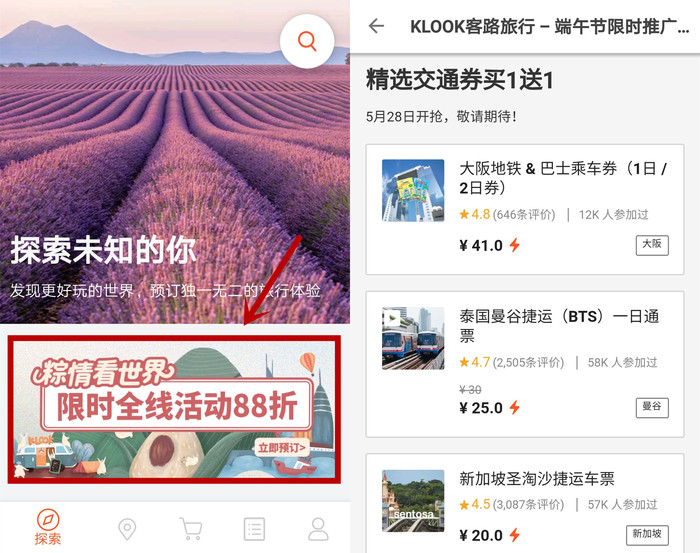 进入KLOOK客路App首页,进入活动页面,往下拉就能看见“精选交通券买1送1”