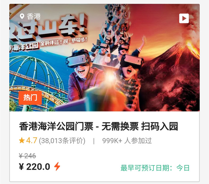 香港海洋公园,原价246元一张,KLOOK优惠价220元一张(仅限香港居民)