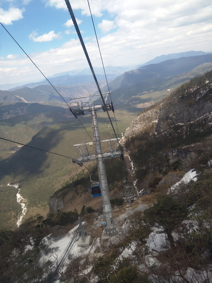 我们乘坐的是大索道,索道轨迹很长,越到上面看下面越高,山体很陡峭,有点怕,是因为越到山顶风越大,吹得我们在车里摇摇晃晃。心里慢慢恐惧。