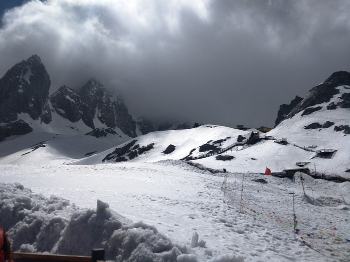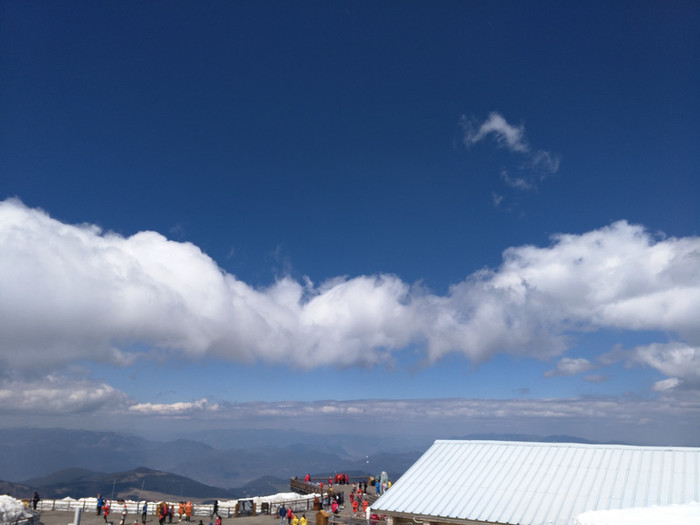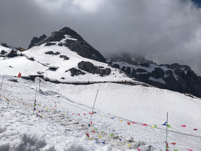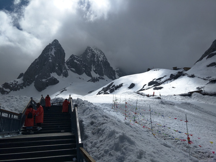 索道上去后,我因为穿着凉鞋裙子,就买了一堆护膝,穿在小腿上,主要保护脚踝。全程脚上不觉得冷反而手快冻僵了。玩了差不多一个半小时吧,陆续出现呼吸不了胸闷的感觉,吸了氧感觉还是不错的,但是也只能顶一下。所以不贪玩了准备下去,主要是排队的人也是超级多的。