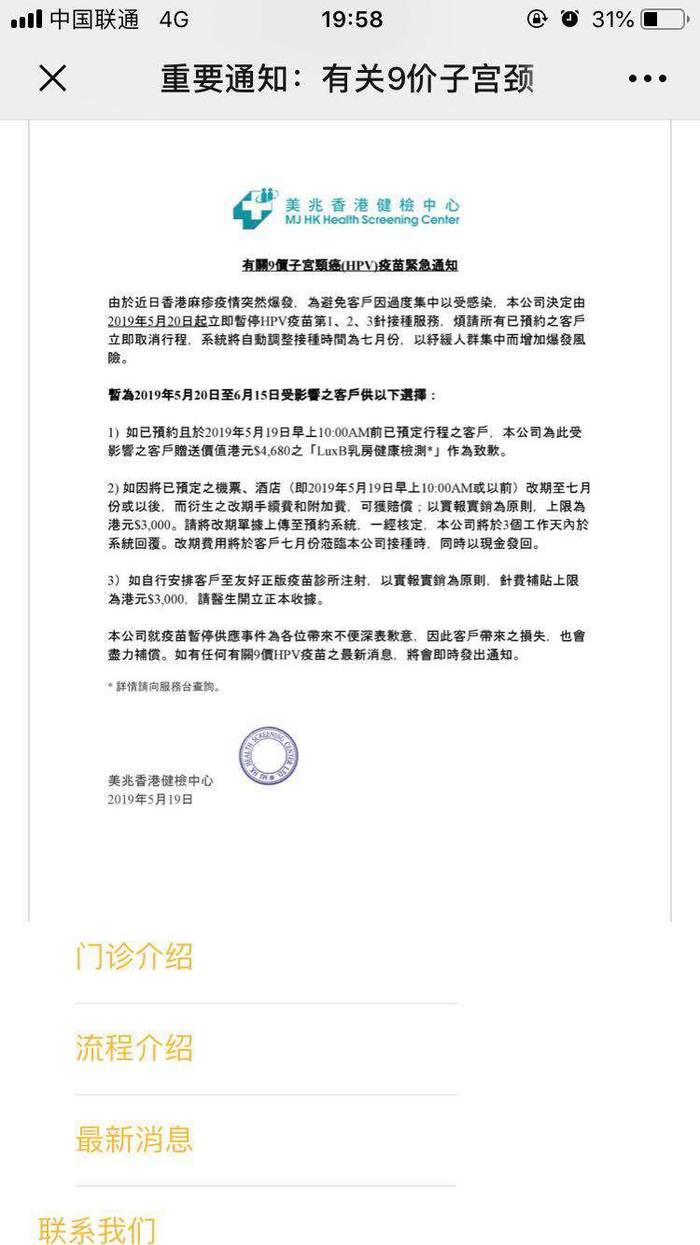 武汉的罗女士告诉澎湃新闻,今年5月初她在美兆香港健检中心(下称“美兆”)完成了第三针九价HPV疫苗的接种,然而,就在5月19日,美兆官网却发布了一则通知,通知称,“因香港麻疹疫情爆发,为避免客户因过度集中还受到感染,美兆将从5月20日起暂停HPV疫苗的接种服务,系统将自动将此前预约接种服务的客户接种时间调整为七月份。”