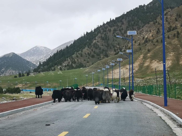 快接近景点的时候,又遇到了拦路的,这次的这些牦牛们还真是悠闲的排成一排在路上逛着,牛哥们惹不起啊,我们只能跟随了很久才得以通过。
