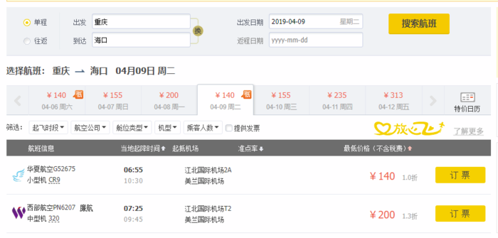 重庆飞海口,网上搜到含税最低190元,含行李,如果有行李托运可以考虑,因为西部航空秒杀不含免费行李托运。