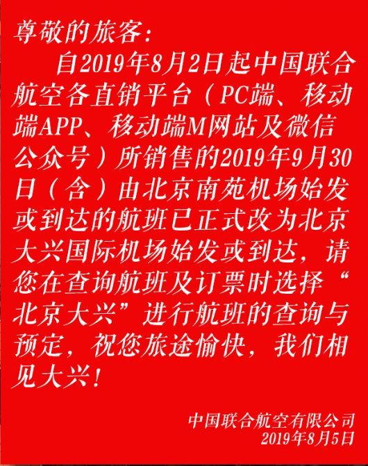 中联航还放出了公共,提醒 后续从“北京南苑机场”改为“北京大兴国际机场”始发或到达,请大家注意~