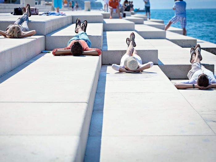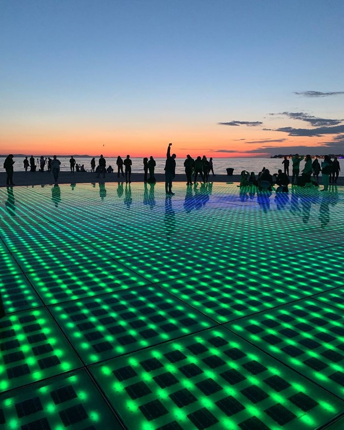 “向太阳致敬”与“海之风琴”是这座小城最热门的两个景点。“向太阳致敬”是由300块太阳能电池板所组成的圆形纪念碑,白天日照下可以收集太阳能,到了傍晚,晚霞与奇妙的灯光营造出令人难以置信的光影声光秀。因此每当日落之后,这里就成为了全城最热闹的地方。