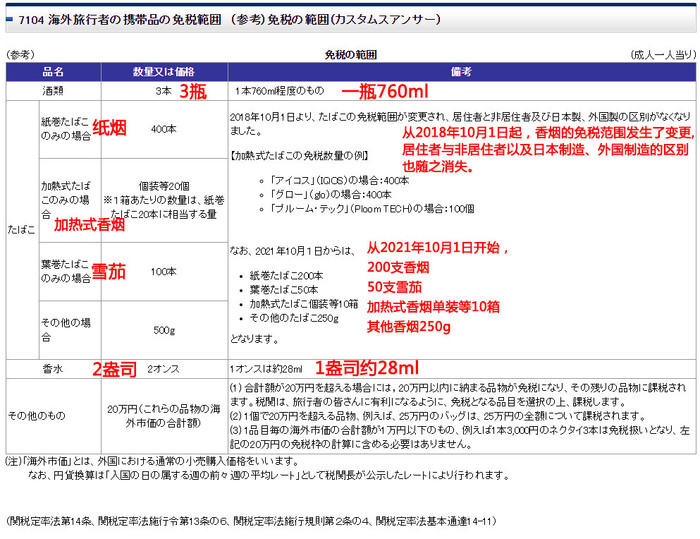 以下为携带物品免税范围(按一个成人计算):