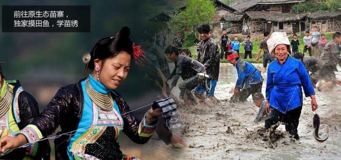2、深入原生态苗寨,入乡随俗,多样性的与孩子们亲身体验活动,抓田鱼、学苗家刺绣;
