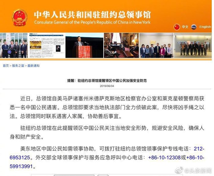 @头条新闻:据中国驻纽约总领事馆网站4日消息:近日,总领馆自美国警方获悉一名中国公民遇害。总领馆即要求当地执法部门全力侦破此案,尽快将凶手绳之以法。驻纽约总领馆在此提醒领区中国公民关注当地安全形势,规避安全风险,确保人身和财产安全。