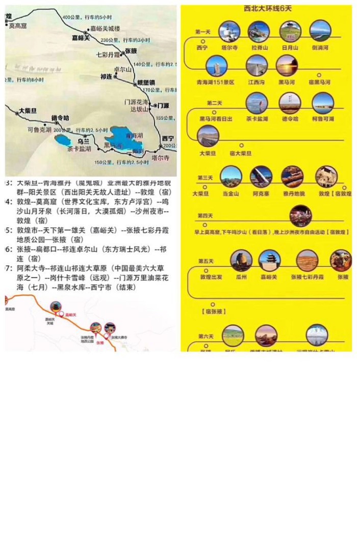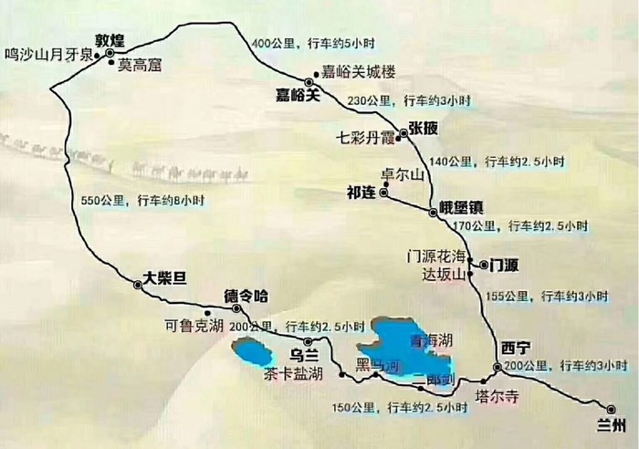我们从地图上看看这条线路,西宁出发,到青海湖,经过茶卡盐湖走德令哈到大柴旦,途径柴达木盆地无人区,进入敦煌,走河西走廊经嘉峪关再到张掖,从张掖走最美国道227,回到西宁,不走回头路,所以称之为丝绸之路大环线。全程2800公里的环线,用时6-7天最为合适,每日路程大概400公里,行程安排轻松合理。