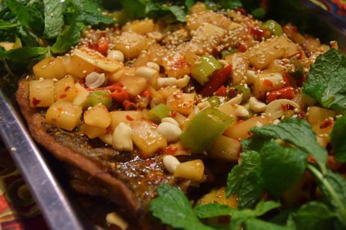 ”东巴烤鱼”是 丽江 茶马古道上流行起来的一道美食。东巴烤鱼的做法是先把鱼肚剖开去除内脏后,陌上了盐,花椒,和五香粉腌制了一段时间,在放在铁锅里先用慢火烤制等到味道吸收之后再放到油锅里炸。整条烤鱼外脆内嫩,吃起来味道非常鲜美。配合风味的豆豉在一起,整个鱼的风味非常香。再加上各种美味的佐料配合在一起,让人回味无穷。东巴烤鱼一定是到 丽江 必吃的一道菜”。 丽江 无论是小餐馆还是纳西餐馆都有。