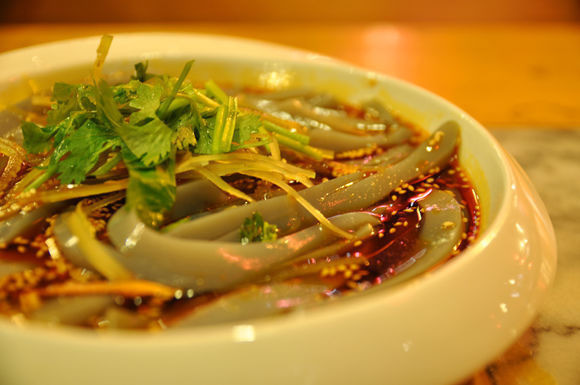 鸡豆凉粉, 丽江 特产的一种凉粉小吃。几百年来,鸡豆凉粉这种风味小吃在 丽江 经久不衰,暑吃凉,寒吃热,极其细腻爽滑、适口,是下饭佐酒的一道风味好菜。大街小巷卖凉粉的都有两手准备,以适应顾客要求。凉吃多在暑季,那晶莹的粉片与红辣椒、绿韭、花椒、青葱、芥沫、酸醋等佐料腌拌起来,色香味俱佳,一碗入腹,开胃又爽口。热吃多在寒凉季节,那 方正 的粉块在平底锅两面煎黄,再按各人味口加上麻、辣、酸的各种佐料,一碗下肚,全身温暖。古城口,红太阳广场,四方街,小吃街随处可见。