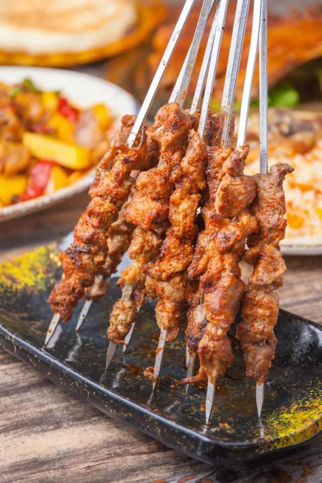 新疆羊肉串也是新疆民族特色的风味小吃。色泽酱黄油亮,肉质鲜嫩软脆,味道麻辣醇香,独具特别风味。