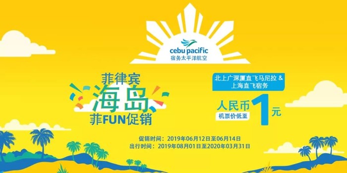 为庆祝菲律宾独立日,宿航1元大促再度来袭,北京/上海/广州/深圳/厦门直飞马尼拉,上海直飞宿务,机票价低至人民币1元!