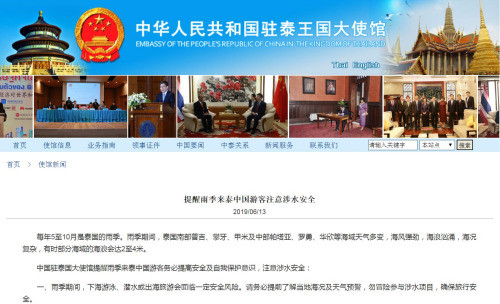 中国驻泰国大使馆提醒雨季来泰中国游客务必提高安全及自我保护意识,注意涉水安全:
