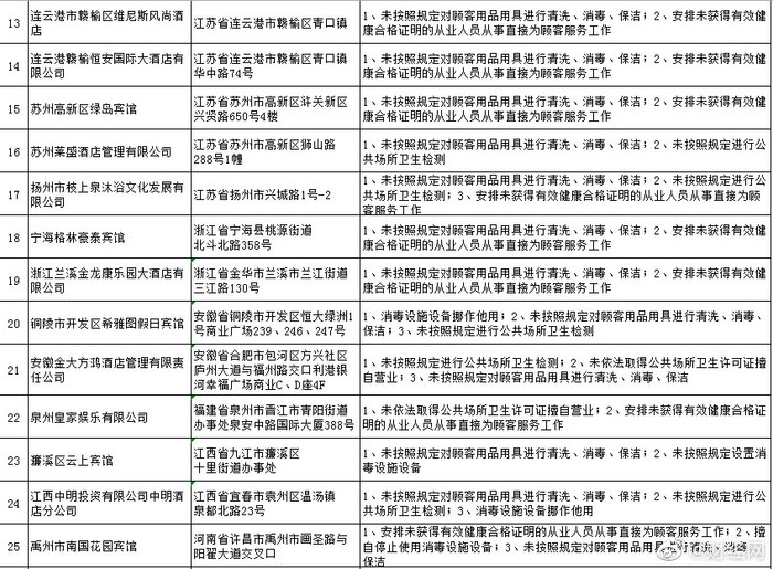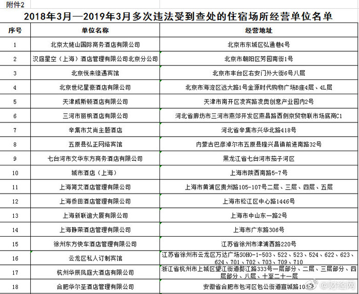 @财经网:国家卫健委13日通报住宿场所卫生专项整治情况。被通报名单中不乏知名连锁酒店,如北京新世界酒店、浙江宁海格林豪泰宾馆因存在多项违法情形被通报,包括未按照规定对顾客用品用具进行清洗、消毒、保洁等。北京朝阳区芳园南街汉庭酒店因在2018年3月至2019年3月间多次违法受到查处被通报。