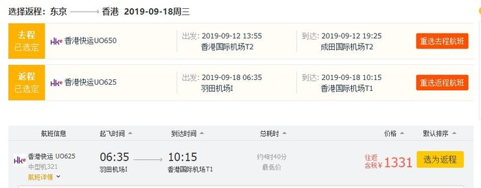 香港=东京,往返含税1331元,跨中秋;