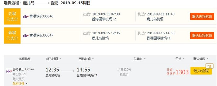 香港=鹿儿岛,往返含税1303元,跨中秋;