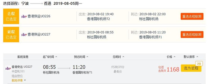 香港=宁波,往返含税1168元,8月上旬出发;
