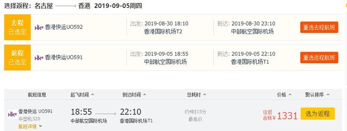 香港=名古屋,往返含税1331元,8月底出发;
