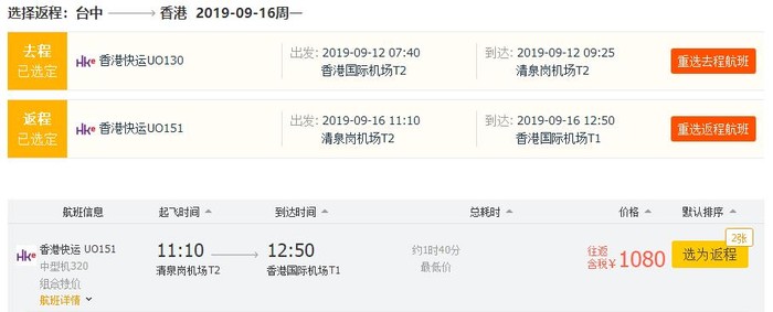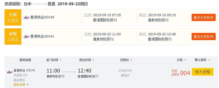 香港=台中,往返含税904元,中秋节后出发;