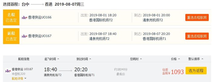 香港=台中,往返含税1093元,8月初出发;