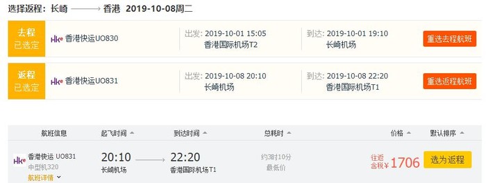 香港=长崎,往返含税1706元,正国庆;