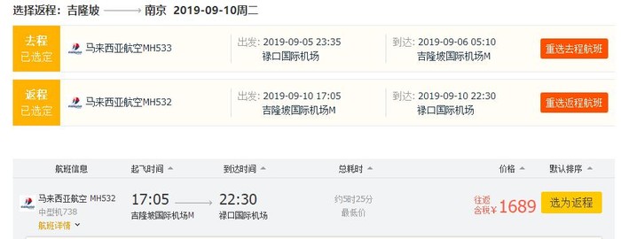 南京=吉隆坡,往返含税1689元,9月5日-9月10日;