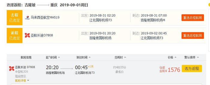 重庆=吉隆坡,往返含税1576元,8月31日-9月2日;