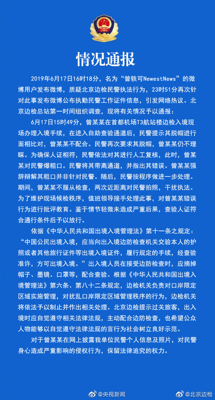 @央视新闻:19日,@北京边检 发布情况通报:17日,@曾轶可NewestNews 发微博质疑北京边检民警执法行为,并公布执勤民警工作证件信息。经调查,当天下午,曾某某在首都机场T3航站楼办理入境手续时,不配合脱帽进行面相对比,民警依法对其进行人工复核却遭其爆粗口,遂将其带离通道。曾某某两次近距离对民警拍照,干扰执法。对于曾某某在网上披露民警个人信息及照片,对民警身心造成严重影响的侵权行为,保留法律追究的权力。