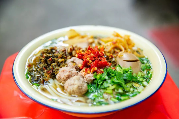 小店隐藏在烈士公园北门临街的居民区内。没有什么过多复杂的调味料,自己炼的猪油,一点盐和酱油,再撒上一点葱花,一勺肉丸筒子骨汤,盖上七、八个肉丸子,奢侈点再加个卤蛋,一碗原汤米粉就靠谱了。猪五花,肥肉,瘦肉,严格按照比例进行调配,老板说这是他的秘方。