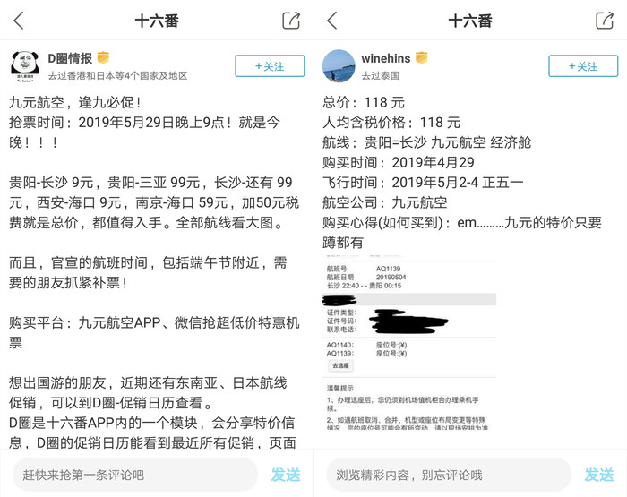 最后分享一下,番友们在十六番【D圈】分享抢到过的特价机票,真的不难抢!