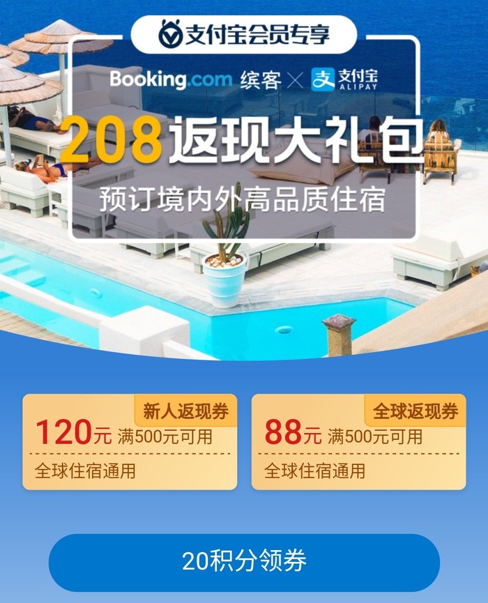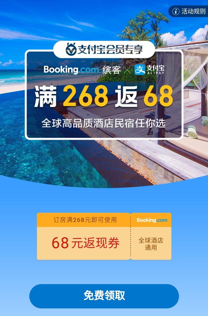 另外,在支付宝会员页面下的酒店特权里面,booking满268使用的68元返现券,可免费领取