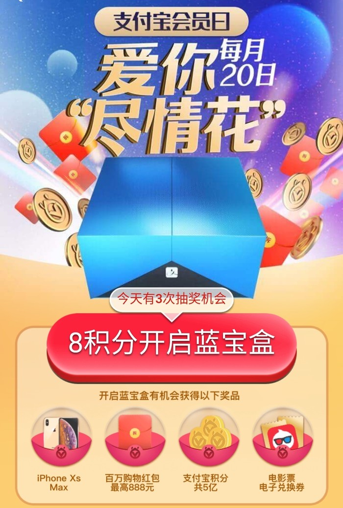 会员日当天有3次开启蓝宝盒的机会,每次开启需耗费8个积分,有机会抽到iPhone X、购物红包、会员积分等奖品,刚刚试了一下,抽到了0.5元购物红包、一张飞猪55元国际/港澳台机票券和18个会员积分,