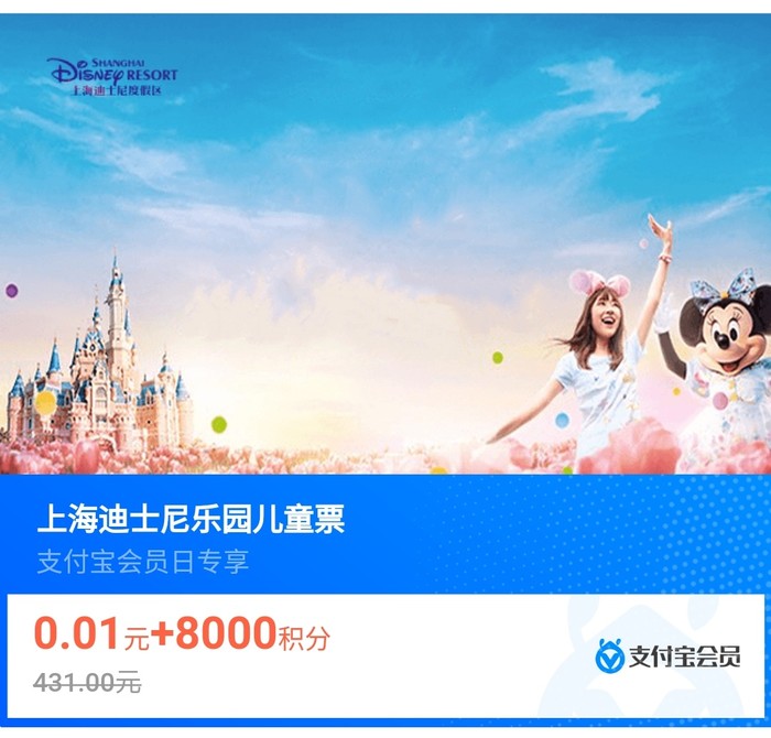 上海迪士尼乐园儿童票,0.01元+8000积分可兑换,6月20日12点,限量100张