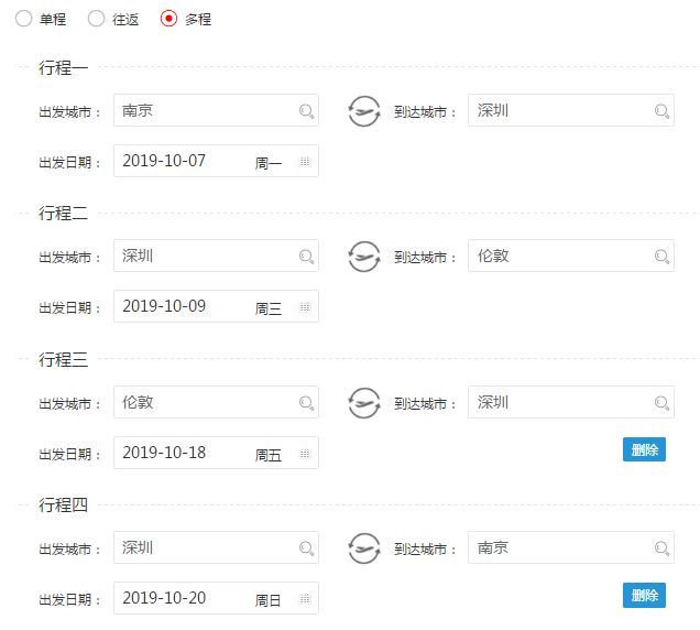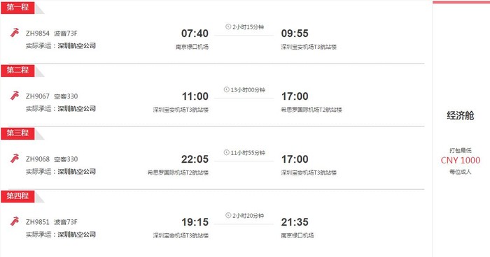② 假如从南京出发,计划去伦敦。就按需选择南京-深圳-伦敦的航班,以及伦敦-深圳-南京回程航班,完成四段行程的选择。
